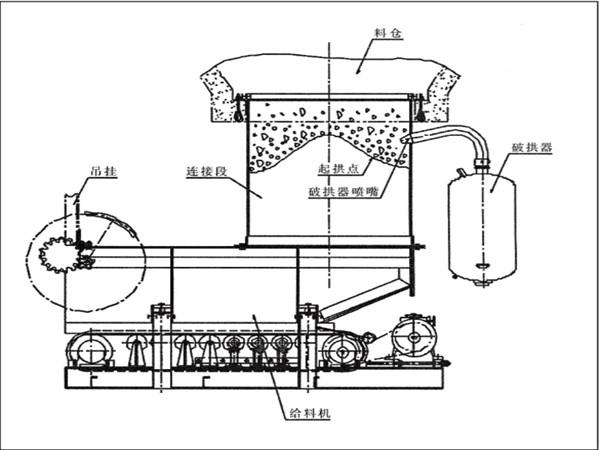 防止在給料機(jī)距離倉口較高的時候,連接段內(nèi)的物料壓實粘結(jié)成拱或粘壁