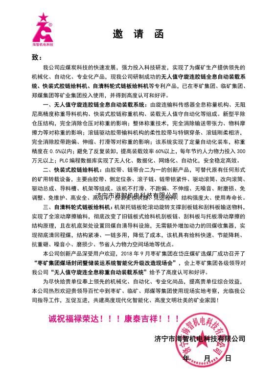 我公司應(yīng)煤炭科技的快速發(fā)展,強(qiáng)力投入科技研發(fā),實現(xiàn)了為煤礦生產(chǎn)提供領(lǐng)先的機(jī)械化、自動化、專業(yè)化產(chǎn)品,現(xiàn)我公司研制成功的無人值守旋連膠鏈全息自動裝載系統(tǒng)、快裝式膠鏈給料機(jī)、自清料輪式鏈板給料機(jī)等專利產(chǎn)品,已在棗礦集團(tuán)、臨礦集團(tuán)、鄭煤集團(tuán)等礦業(yè)集團(tuán)投入使用,并得到高度認(rèn)可和好評。